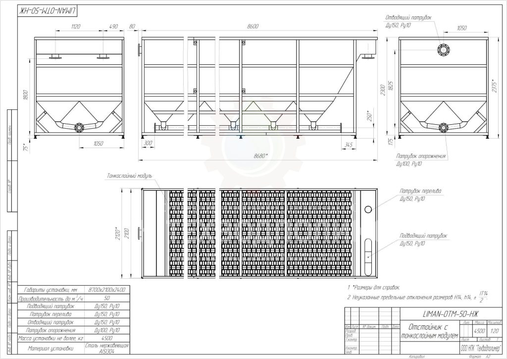 - Мы предоставляем полные расчеты производительности, подбор типоразмера под конкретный гранулометрический состав взвеси. Отстойник проектируется под ваши задачи, а не «подбирается с полки».